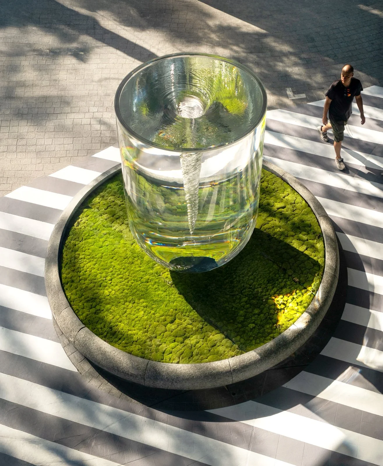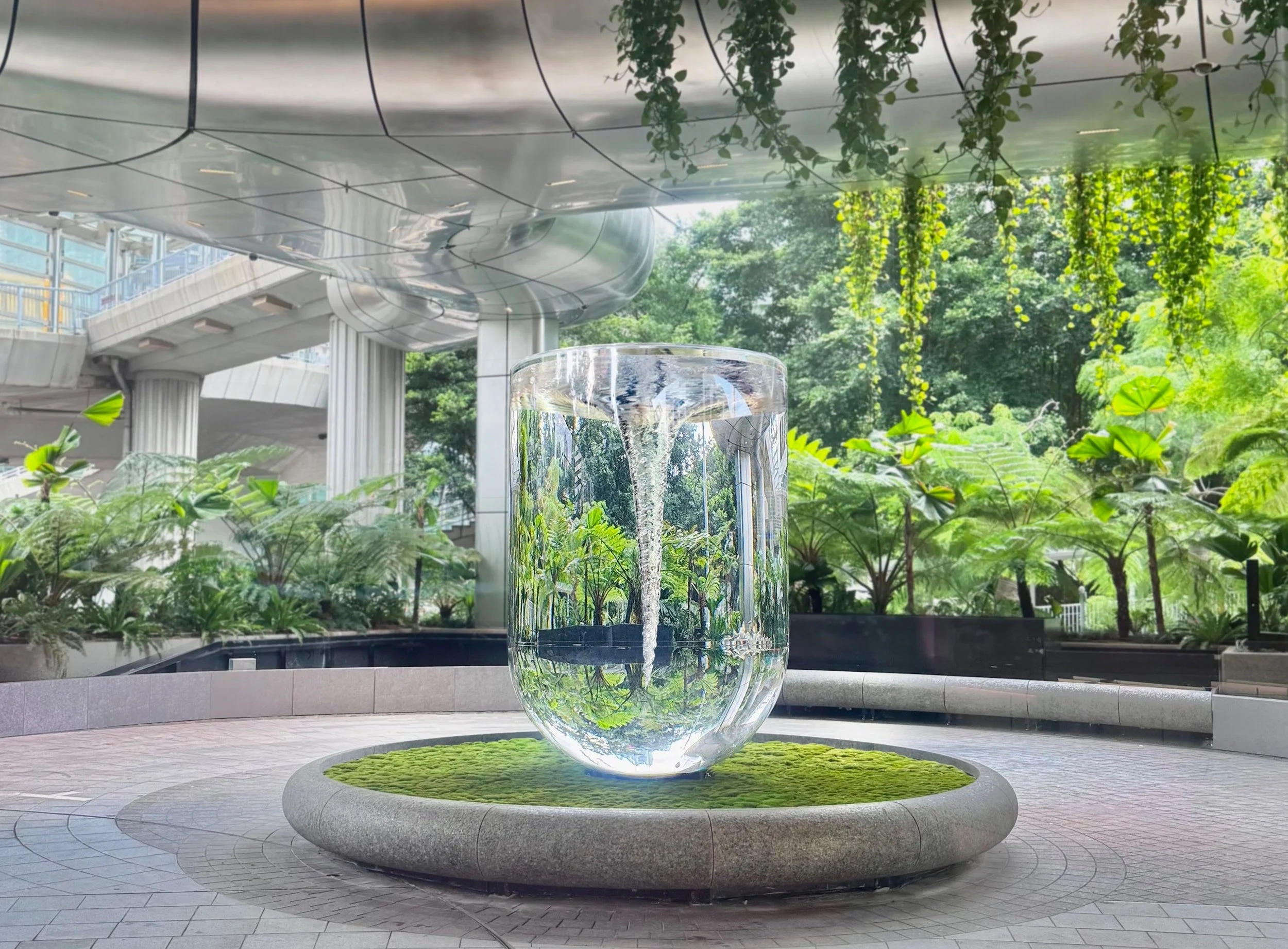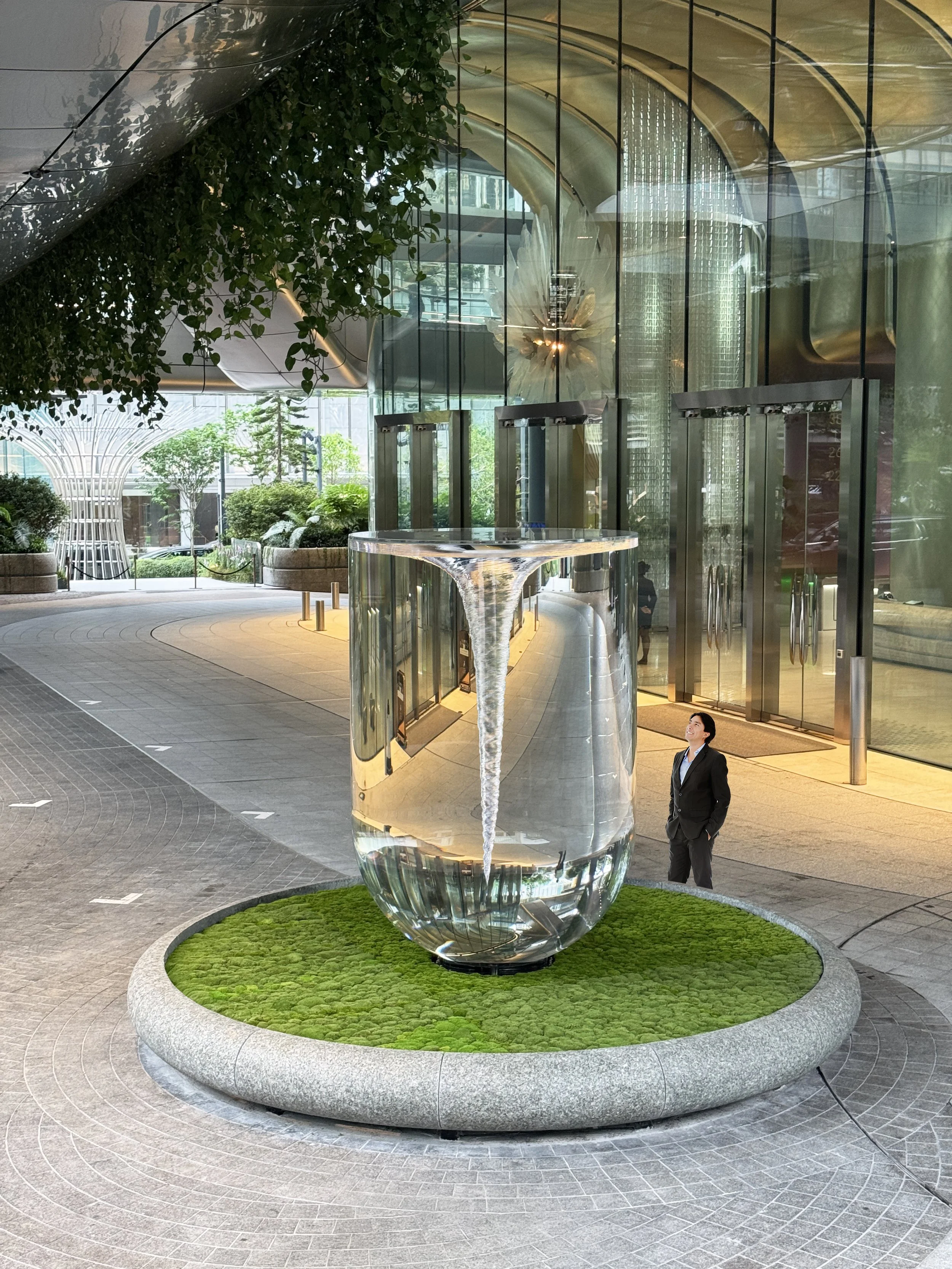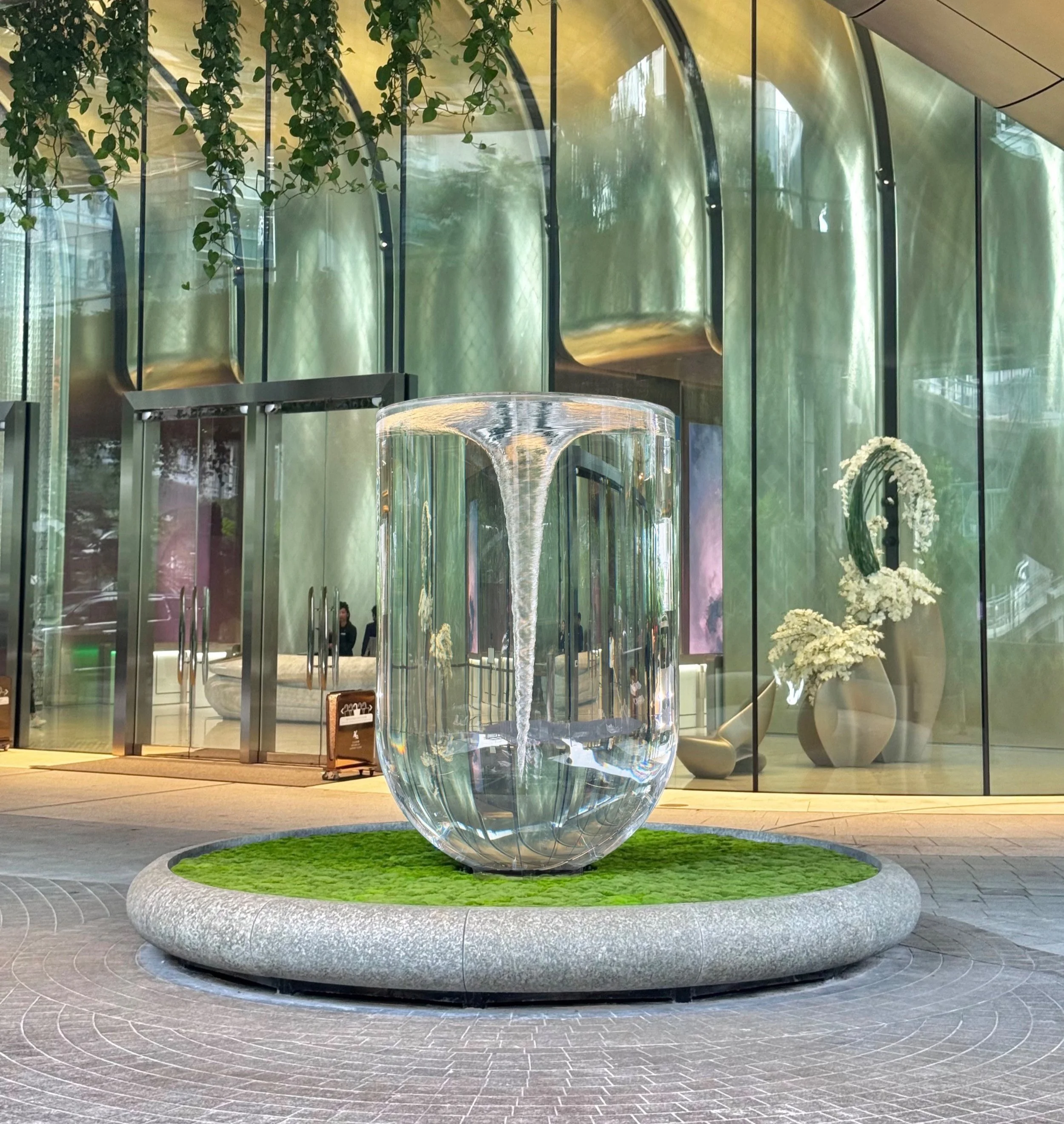 Standing three meters tall, this elevated liquid sculpture, the largest of its kind, reframes its architectural surroundings through distortion and inversion, rendering the lobby and its visitors part of an unfolding visual field. As light bends through its fluid body, the sculpture animates the space with a quiet intensity, transforming the environment into a subtly shifting, immersive experience.