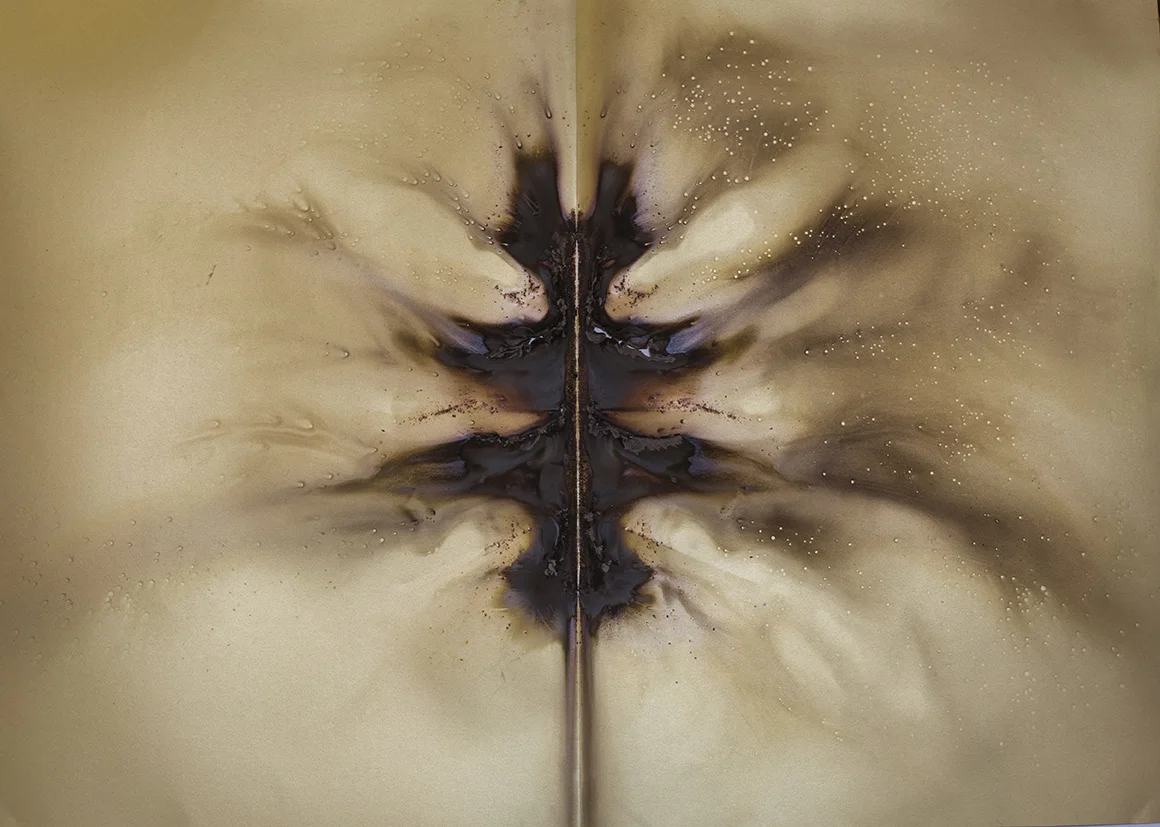 Deflagrations within containers of gunpowder onto a variety of surfaces create symmetrical pieces, tracing the escape routes of the flame's explosive path, once again creating controlled environments for the free movement of energy.