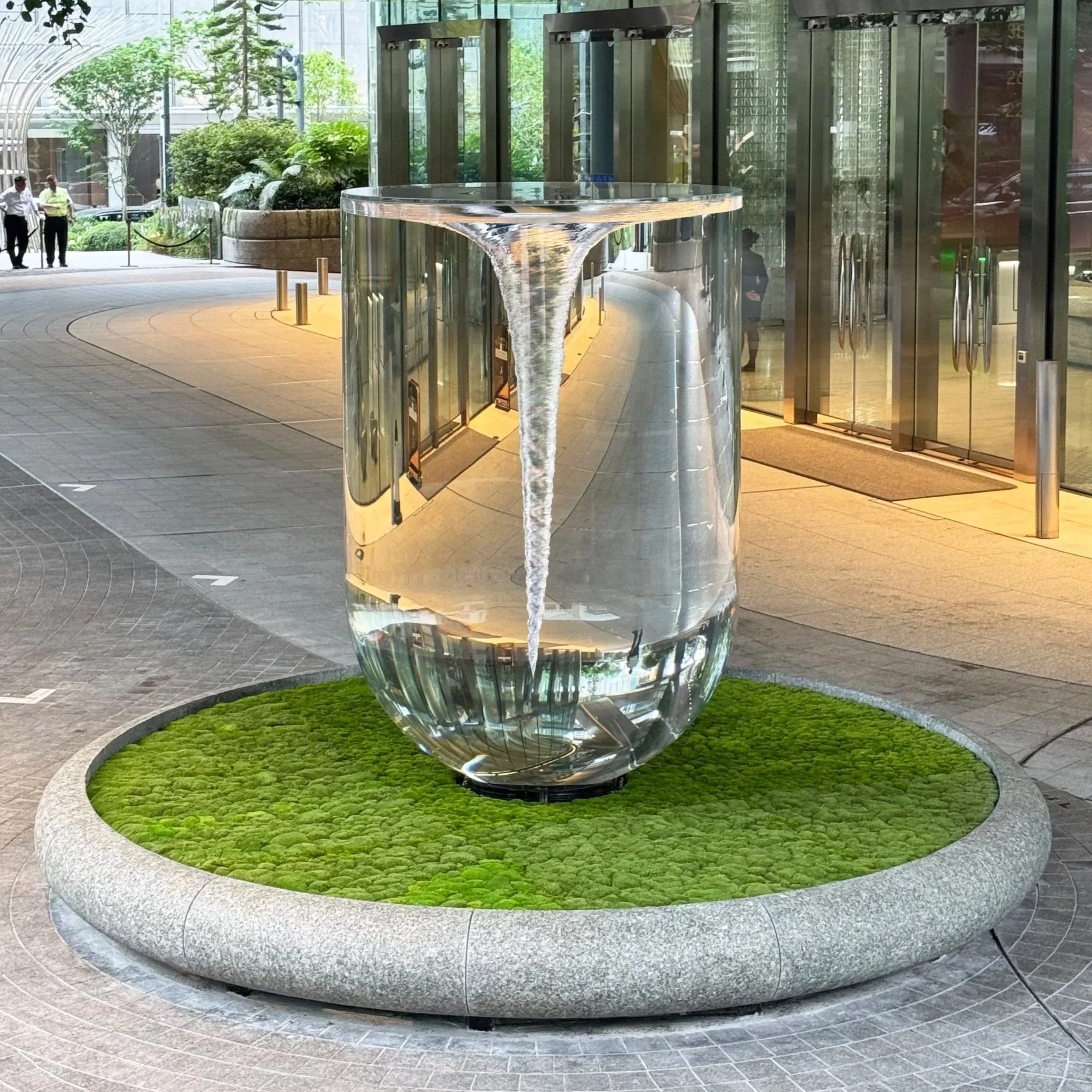 Public art installation of a large, transparent, cylindrical water fountain with water flowing from the top into a glass-like basin, surrounded by a circular bed of green moss and situated outside a modern building.